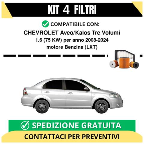 Kit filtri completo per chevrolet aveo/kalos tre volumi 1.6 75 kw benzina 2008-2024. Il kit include: filtro olio, filtro carburante, filtro aria,. Il kit non comprende l'olio motore, ma può essere aggiunto su richiesta contattando il servizio clienti. I marchi dei filtri vengono selezionati al momento della spedizione in base alle giacenze di magazzino e possono variare; non è possibile conosce...