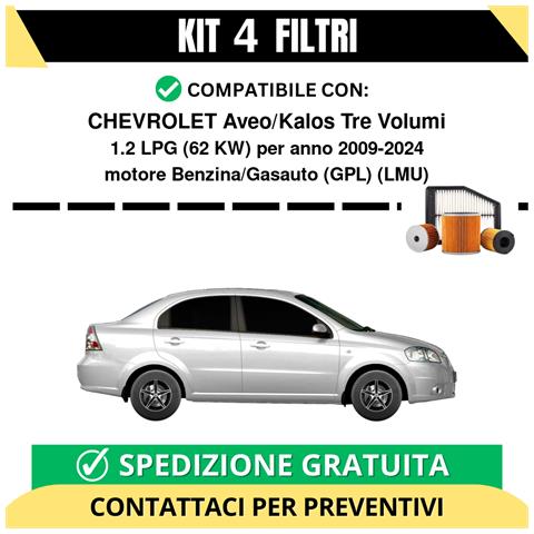 Kit 4 Filtri Tagliando Per Chevrolet Aveo/kalos Tre Volumi 1.2 Lpg 62 Kw Benzina/gasauto (gpl) 2009-2024
