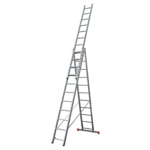 Scala trafsormabile a 3 elementi in alluminio corda antiapertura di sicurezza ad alta tenuta. Altezza cm 258>569, 3 elementi da 9 gradini l'uno. Barra stabilizzatrice con piedini antiscivolo. Portata Kg 150. Posizioni di utilizzo: in appoggio a parete o a portafoglio. Normativa UNI-EN131 D. Lgs 81/08