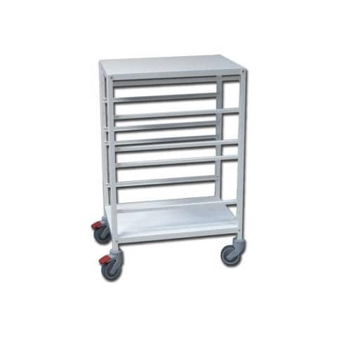 Carrello di servizio per vaschette e cestelli ISO (non inclusi) in acciaio verniciato con polveri epossidiche. Fornito completo di 5 coppie di guide per l'alloggiamento di cestelli / vaschette ISO. Possibilità di estrarre i cassetti da ambo i lati. Sulle guide sono presenti dei fermi per evitare la fuoriuscita accidentale durante il trasporto. Ruote girevoli Ø 100 mm (2 con freno) . Produzione ...