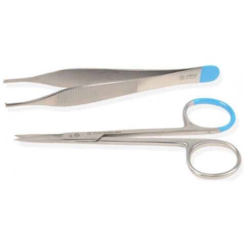 Caratteristiche: kit sterile per rimozione sutureil kit ? composto da:? Forbici iris - rette - 11.5 cm? Forbici adson dentate - 12 cmconfezione da 25 pezzi.una linea completa di strumenti monouso progettata per garantire agli utilizzatori una buona qualit? e un materiale robusto alternativo rispetto ai classici strumenti in plastica.ogni articolo presenta una parte colorata di blu al fine di ev...