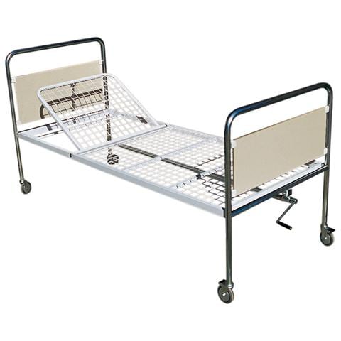 Letto articolato 1 snodo: struttura in acciaio verniciato con rete. 1 struttura tubolare con rete per regolazione testa, 200x85 cm. Struttura alla base di testa e piedi in acciaio cromato, completa di pannelli in MDF bilaminato rivestito in formica. Movimento attraverso manovella. Protezione a fine corsa. Ruote in gomma 100 mm, con freno.