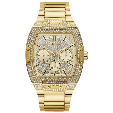 Orologio multifunzione da uomo di guess collezione phoenix. Cassa 43 mm in acciaio collore oro giallo con cristalli trasparenti e quadrante con pavé di cristalli trasparenti. Bracciale acciaio collore oro giallo lucido, chiusura pilota. resistenza all'acqua 50 metri.