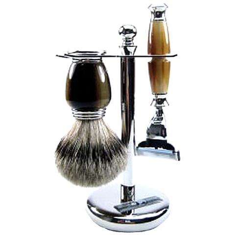 Set rasatura con rasoio mach3, pennello da barba setole puro e soporte in un design elegante con resina e cromo. rasoiorasoio per una elegante e piacevole rasatura bagnata. il manico è progettata in ottica a corno e conferisce al rasoio un aspetto particolarmente nobile. La forma è anche speciale con un incavo al centro del manico leggermente arcuata sul quale il rasoio può essere fissato al su...