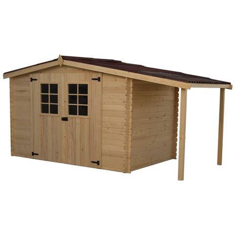 Habrita rifugio con tronchi di legno massiccio 5,06 m² bicromato mo3020.02bn casetta da giardino habrita mo3020.02bn da 28 mm con la sua legnaia per riporre la legna o le biciclette taglio chalet per il montaggio a parete angolare solida e impermeabile. Taglio smussato all'estremità delle lame. Da colorare dentro e fuori subito dopo il montaggio. Da installare su una soletta in cemento. - mater...