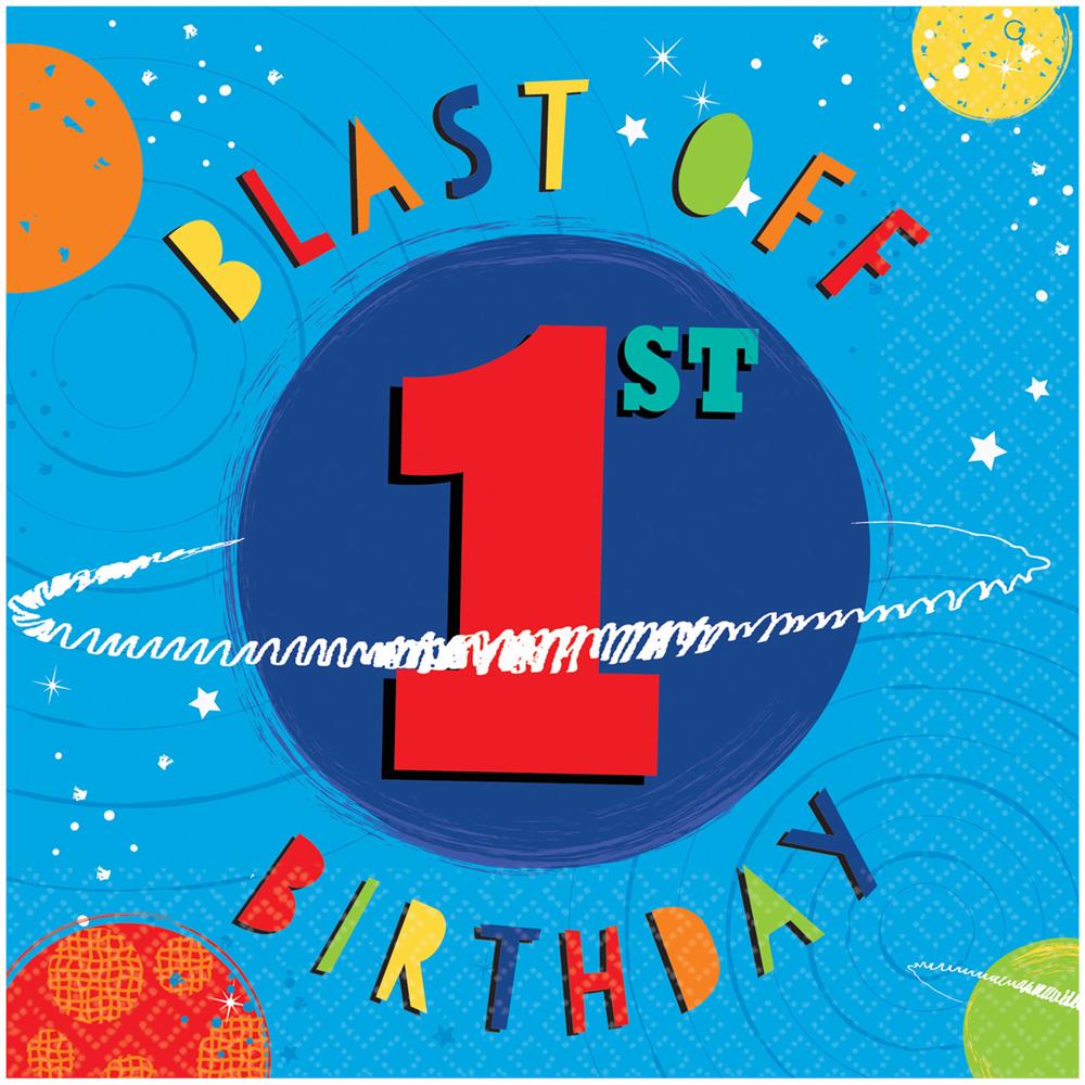 Questa confezione contiene 16 tovaglioli di carta. Misurano circa 16.5 x 16.5 cm. Sono blu con la scritta centrale ""blast off birthday"" ed il numeri 1 in un pianeta. Altri pianeti e stelle sono stampati intorno. Ideali per il suo primo compleanno!.