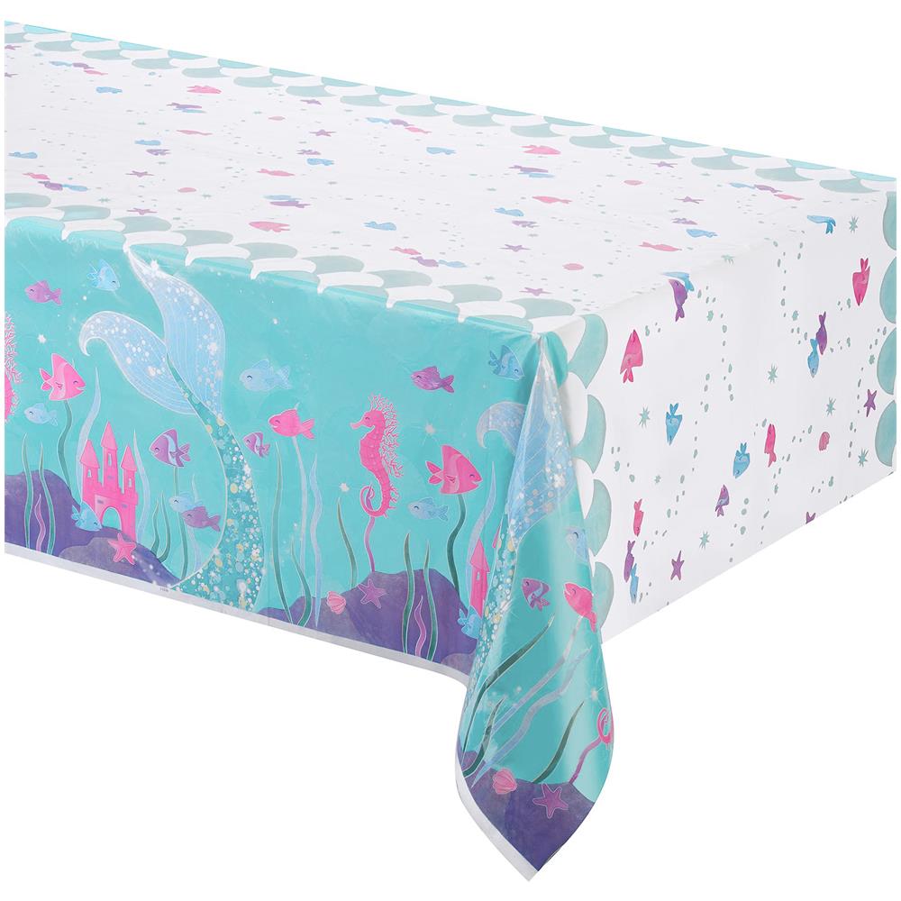 Questa tovaglia misura 1.37 x 2.13 metri. È in plastica sottile. Ha una stampa di un fondale marino con una sirena, circondata da pesci e conchiglie. Perfetta per completare la decorazione del tuo compleanno speciale!.