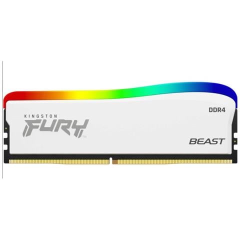 Kingston Technology FURY Beast RGB Special Edition. Componente per: PC, RAM installata: 8 GB, Layout di memoria (moduli x dimensione) : 1 x 8 GB, Tipo di RAM: DDR4, Velocità memoria: 3600 MHz, Fattore di forma memoria: 288-pin DIMM, Latenza CAS: 17, Colore del prodotto: Bianco.