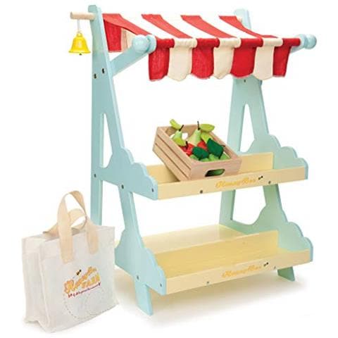 Painted wooden market stall red and white striped canopy integral bell includes a crate of apples and pears further crates of food can be purchased separately.
