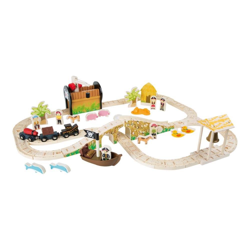In questa ferrovia di legno sei pirati governano indisturbati la propria isola. I binari di legno presentano anche un ponte ed una campana. Il trenino trasporta un cannone ed uno scrigno pieno d´oro per tutto il percorso. Tutti gli animali e gli accessori sono lavorati in legno robusto ed in plastica, i quali rendono l´ambientazione ancora più speciale.
