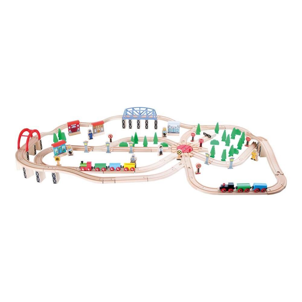 Con questo versatile set di ferrovie in legno ci si potrà immergere nel mondo dei trenini. Binari e scambi in legno resistenti porteranno a destinazione in modo sicuro tutti i trenini. Alberi e diversi edifici in legno completano il paesaggio.