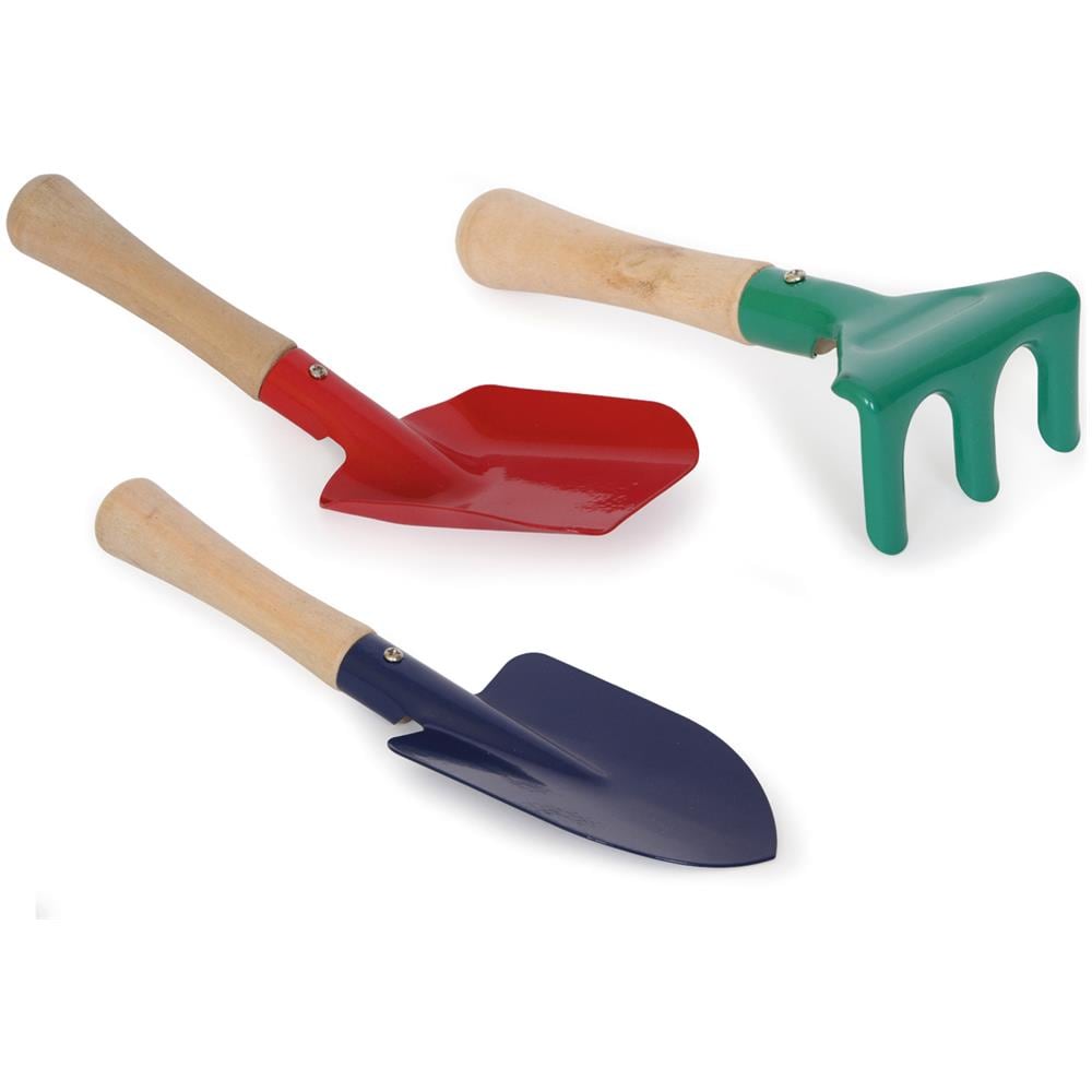 Set per sabbia, piccolo.attrezzi da giardinaggio per bambini, serie con 3 elementi.
