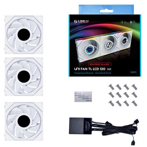 Lian Li UNI FAN TL LCD. Tipo: Ventilatore, Diametro del ventilatore: 12 cm, Velocità (minima) di rotazione: 350 Giri/min, Velocità (massima) di rotazione: 1900 Giri/min, pressione dell'aria massima: 2,83 mmH2O, Tipo di cuscinetto: Cuscinetto fluido dinamico (FDB). Colore del prodotto: Bianco