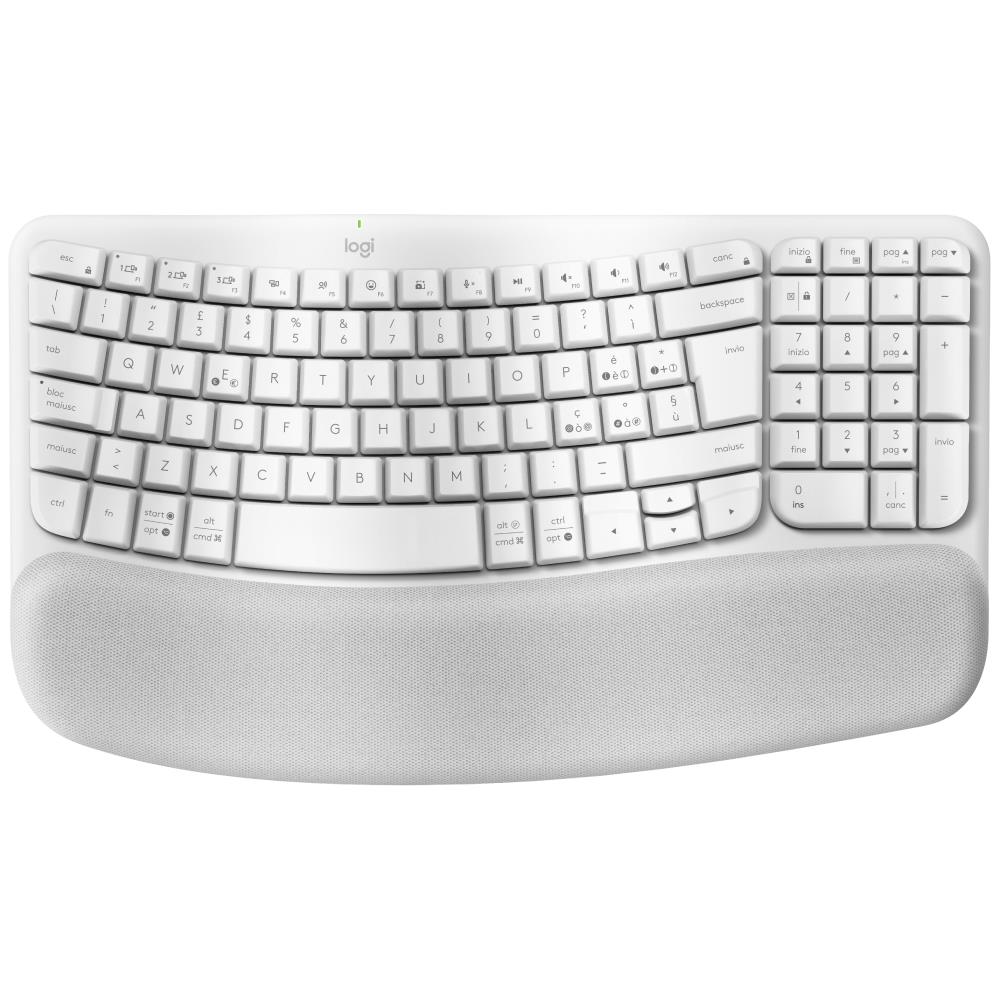 Logitech Wave Keys. Fattore di forma tastiera: Full-size (100%). Stile tastiera: Curvo. Interfaccia dispositivo: RF senza fili + Bluetooth, Interruttore a chiave per tastiera: Interruttore a chiave a membrana, Struttura tastiera: QWERTY. Riposo del polso. Utilizzo raccomandato: Ufficio. Colore del prodotto: Bianco