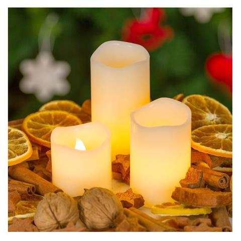 Set 3 candele cilindriche diametro 5 cm cera colore avorio. 1 led classic con effetto fiamma flickering. Batteria 1xcr2032 (inclusa). Uso interno. Dimensioni 5; 7,5; 10cm. Scatola pvc color.