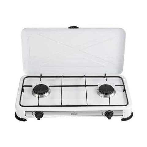 Fornello a gas 2 fuochi. Base in alluminio con piedini in plastica. Griglia removibile. Regolazione della fiamma. Funzionamento a gpl. Solo per utilizzo esterno. Con coperchio. Colore: Bianco.