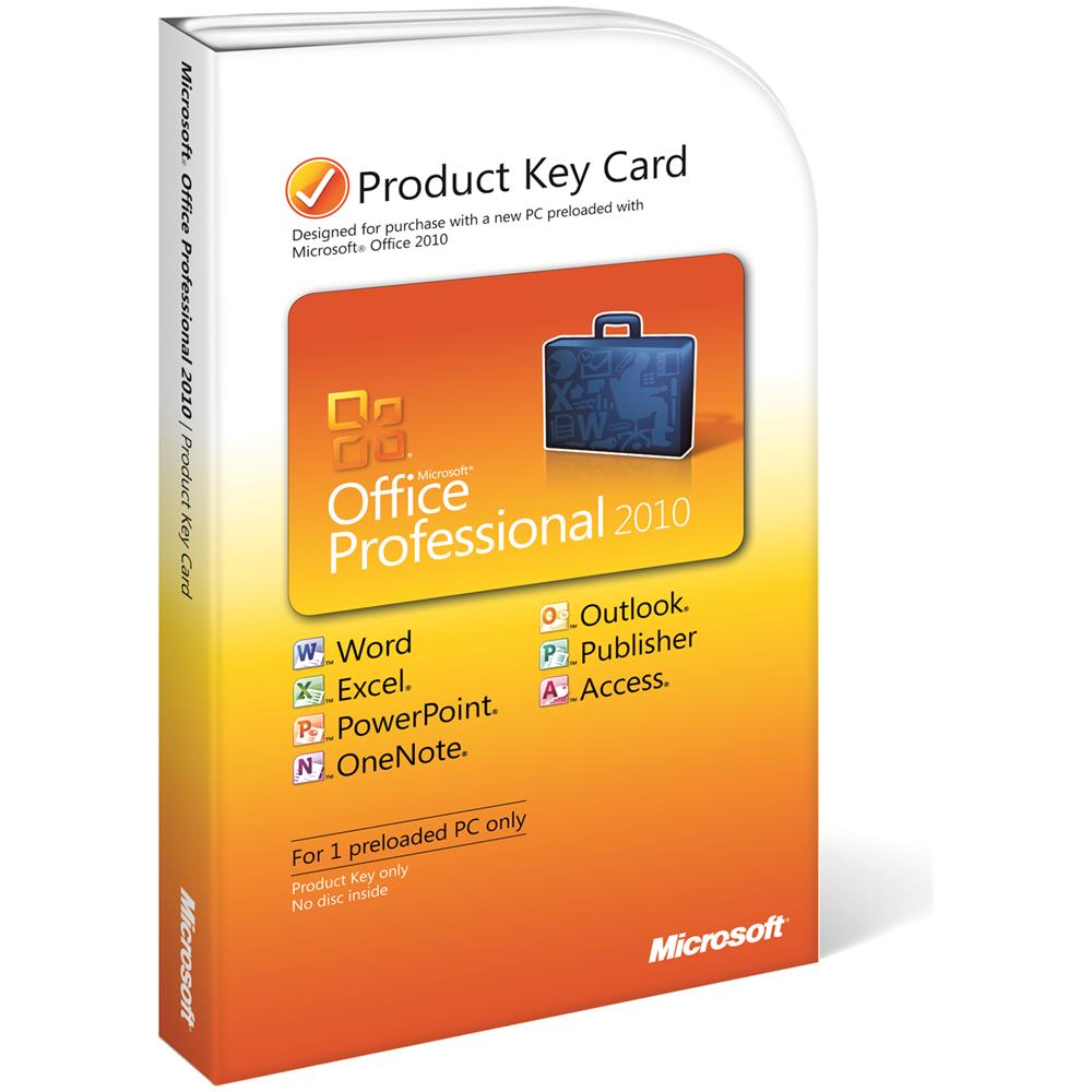 Office Professional 2010 EN, ENG, 500 MHz, Windows 7, Windows Vista (SP1) , Windows XP (SP3) (32-bit) , Windows Server 2008, Windows Server 2003, Word, Excel, PowerPoint, Outlook, OneNote, Access, and Publisher