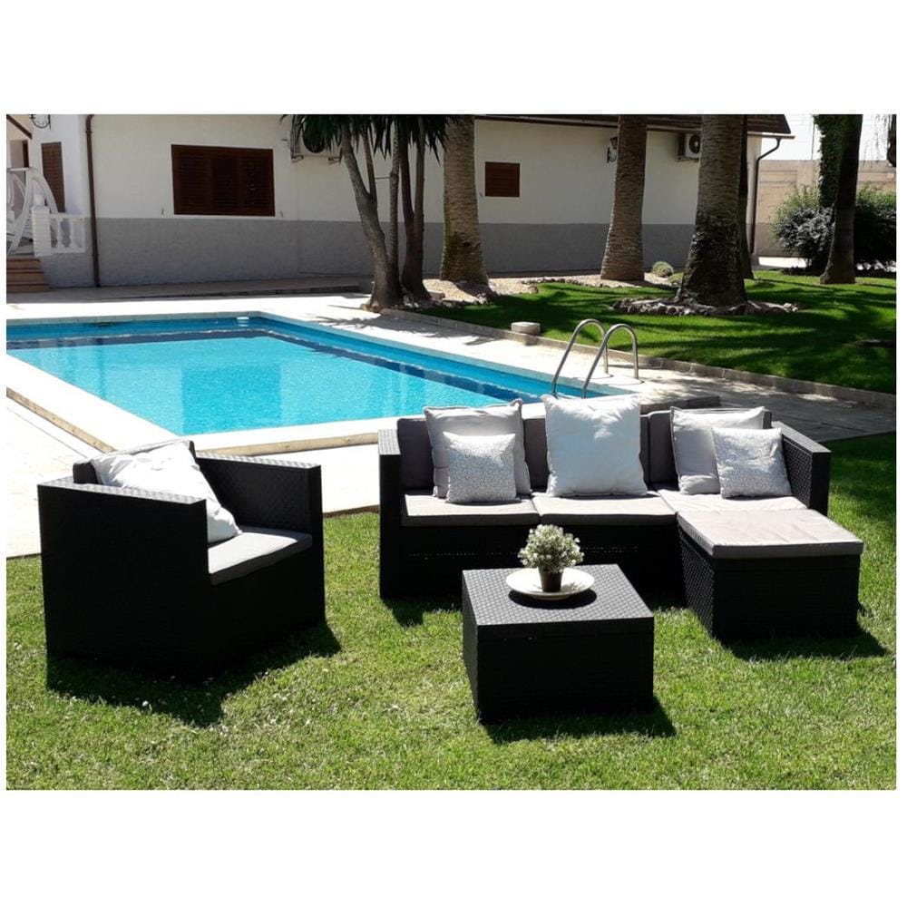 Salotto da giardino: un divano angolare 4 posti, una poltrona e un tavolino - resina stampata trattamento anti-uv e impermeabile - colore: antracite - manhattan.