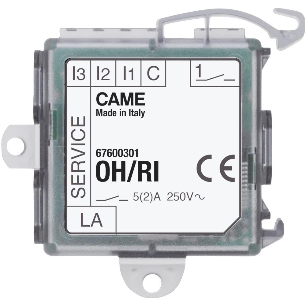 Camesku: 67600301ean: 8004487064328mod.: oh /ridescrizione prodotto came :dispone di 1 uscita a relè con contatto no per comandare un carico elettrico e 3 ingressi digitali per il collegamento di dispositivi di comando (pulsanti o contatti di uscita rivelatori). Il contenitore permette l'installazione da quadro su guida din o da incasso su fondo scatola.