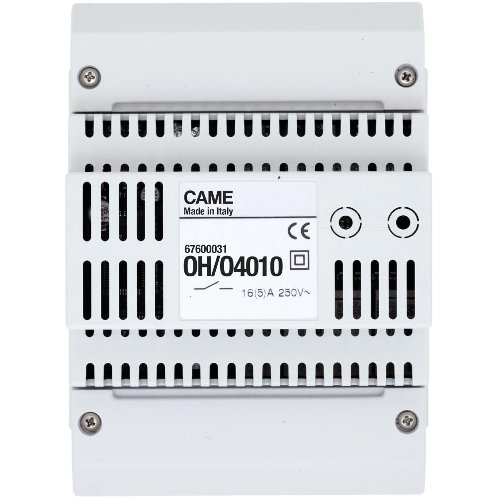 Camesku: 67600031ean: 8004487064175mod.: oh /ao4010descrizione prodotto came :dispone di 4 uscite analogiche tipo 0-10v, di 4 uscite a relè con contatto no per alimentare e disalimentare i relativi carichi elettrici collegati e di 4 ingressi per il collegamento di dispositivi di comando (pulsanti). Il contenitore permette l'installazione da quadro su guida din.