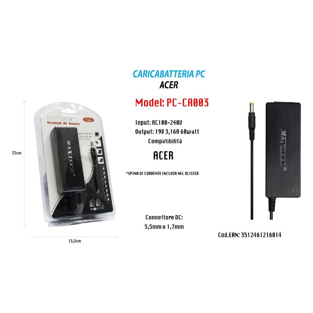 Alimentatore Caricabatteria Per Pc Notebook Acer 19v 3,16a 60w Maxtech Pc-ca003