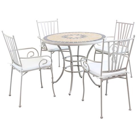 Set Tavolo Giardino Rotondo Fisso Con Piano In Mosaico Ø 90 Con 4 Poltrone In Ferro Tortora Per Esterno