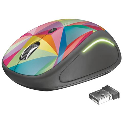 Trust Yvi FX. Fattore di forma: Ambidestro. Tecnologia di rilevamento del movimento: Ottico, Interfaccia dispositivo: RF Wireless, Risoluzione movimento: 1600 DPI, Tipo di pulsanti: Tasti premuti, Numero di tasti: 4, Tipo di scorimmento: Rotella. colore d'illuminazione: Multi. Alimentazione: Batterie. Peso mouse: 84 g. Colore del prodotto: Multi