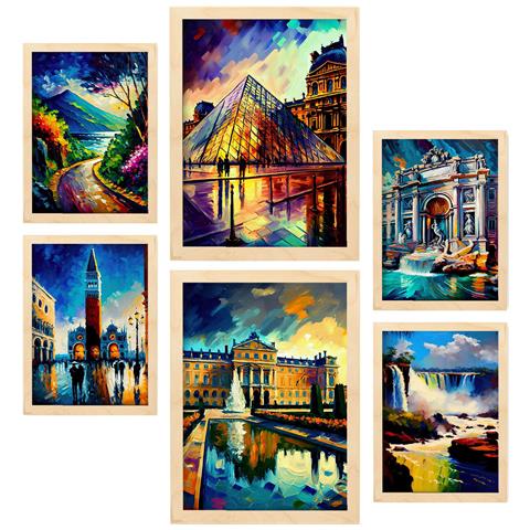 Set Di 6 Stampe Angoli In Stile Dipinto A Olio. Illustrazioni Di Monumenti E Città In Stile Fotografico A Colori. A3 & A4 Telaio In Legno Chiaro