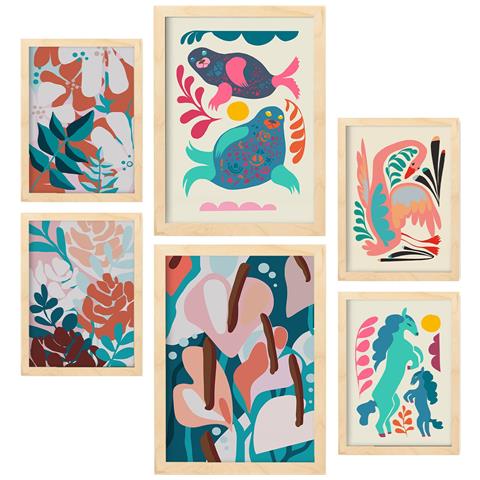 Set Di 6 Stampe Armonia Vivente Negli Animali Astratti Dipinti Decorativi Estetici Per Il Tuo Soggiorno A Casa A3 & A4 Telaio In Legno Chiaro