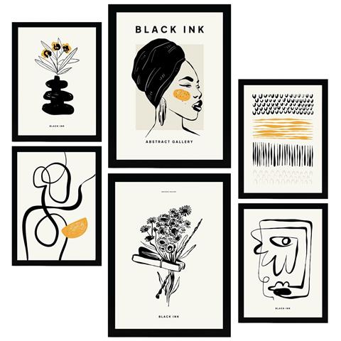 Set Di 6 Stampe Artistiche E Astratte Con Inchiostro Nero Per L'interior Design A3 & A4 Cornice Nera