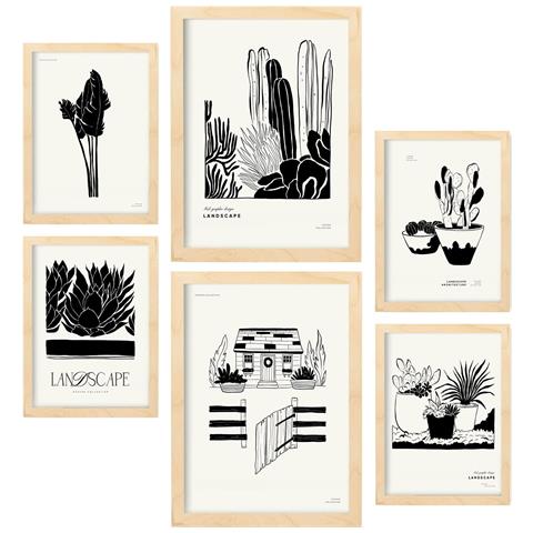 Set Di 6 Stampe Artistiche E Astratte Per L'interior Design Con Inchiostro Nero Per Il Cortile A3 & A4 Telaio In Legno Chiaro