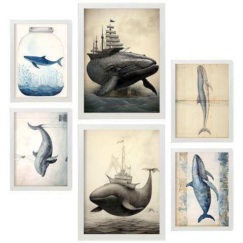 Set Di 6 Stampe Balene Nella Cameretta Dei Bambini: Dipinti Decorativi Estetici Per Il Tuo Soggiorno, Camera Da Letto, Casa A3 & A4 Cornice Bianca