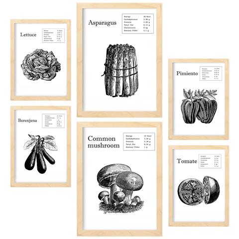 Set Di 6 Stampe Collezione Di Poster Di Verdure Con Estetica Collage Per La Decorazione D'interni A3 & A4 Telaio In Legno Chiaro