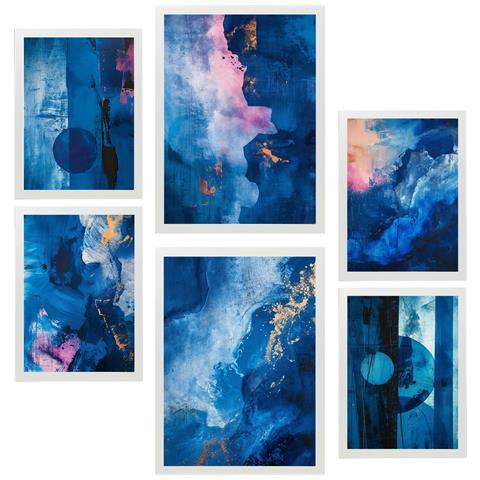 Set Di 6 Stampe Colori Astratti, Blu, Ciano, Rosa, Forme Incorniciate Con Illustrazioni Di Design Per La Casa, La Stanza, Il Negozio, La Pittura A3 & A4 Cornice Bianca