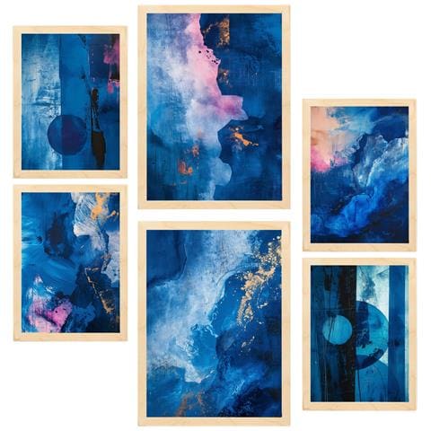 Set Di 6 Stampe Colori Astratti Blu Ciano Rosa Forme Incorniciate Con Illustrazioni Per La Casa Negozio Pittura A3 & A4 Telaio In Legno Chiaro