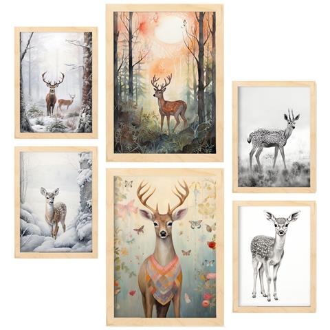 Set Di 6 Stampe Dipinti Decorativi Estetici Raffiguranti Cervi All'asilo Per Il Soggiorno, La Camera Da Letto E La Casa A3 & A4 Telaio In Legno Chiaro