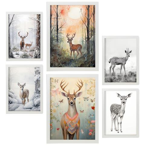 Set Di 6 Stampe Dipinti Decorativi Estetici Raffiguranti Cervi All'asilo Per Il Soggiorno, La Camera Da Letto E La Casa A3 & A4 Cornice Bianca