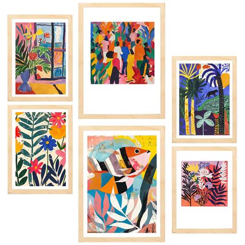 Set Di 6 Stampe Dipinto Decorativo Dai Toni Gialli E Rossi Di Matisse, Colori Forti, Incorniciato Con Illustrazioni A3 & A4 Telaio In Legno Chiaro