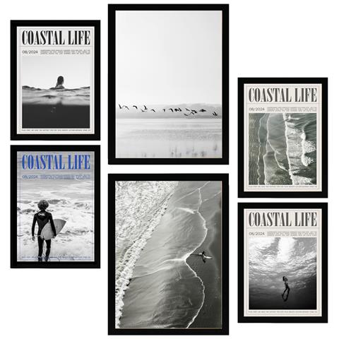 Set Di 6 Stampe Dipinto Decorativo Estate, Spiaggia E Mare Incorniciato Con Illustrazioni Di Design Per La Decorazione Murale A3 & A4 Cornice Nera