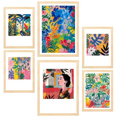 Set Di 6 Stampe Dipinto Decorativo Floreale E Sorprendente Matisse Incorniciato Con Illustrazioni Di Design Per Le Pareti A3 & A4 Telaio In Legno Chiaro