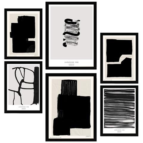 Set Di 6 Stampe Dipinto Decorativo In Inchiostro Giapponese, In Bianco E Nero, Con Cornice E Illustrazioni Di Design Per Le Pareti A3 & A4 Cornice Nera