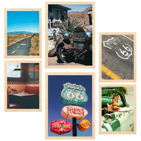 Set Di 6 Stampe Dipinto Decorativo Route 66 Usa E Cultura Incorniciato Con Illustrazioni Di Design Per La Decorazione Murale A3 & A4 Telaio In Legno Chiaro