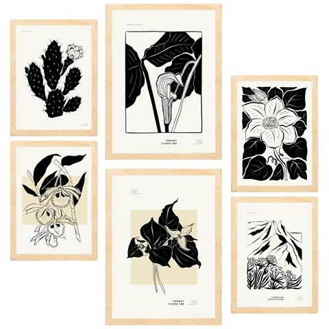 Set Di 6 Stampe Fiori In Bianco E Nero 2 Incorniciati Con Illustrazioni Di Design Per Le Pareti Del Tuo Negozio Di Pittura Per La Stanza Di Casa A3 & A4 Telaio In Legno Chiaro