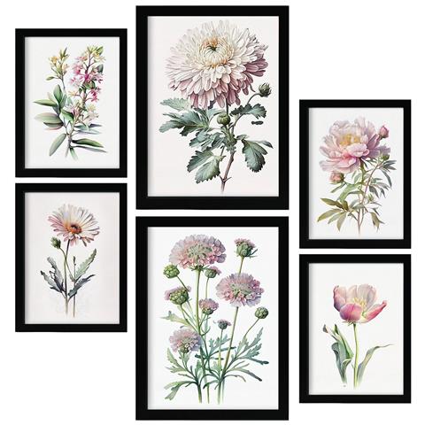 Set Di 6 Stampe Fiori Rosa Stampe Naturalistiche E Botaniche A Colori Con Motivi Floreali Su Sfondi Bianchi Puri A3 & A4 Cornice Nera