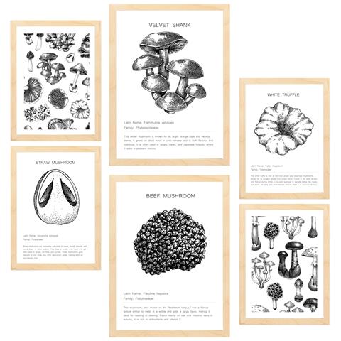 Set Di 6 Stampe Foglio Decorativo Con Composizione Di Funghi In Bianco E Nero Con Illustrazione Di Design Per Decorare A3 & A4 Telaio In Legno Chiaro
