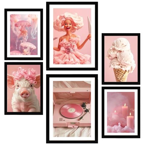 Set Di 6 Stampe Illustrazione Di Design Iconica, Rosa, Audace E Giovanile Per Decorare Le Pareti Della Tua Casa A3 & A4 Cornice Nera