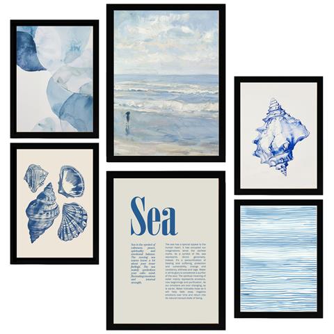 Set Di 6 Stampe Illustrazioni Decorative Di Dipinti Marini Blu E Estate Incorniciate Con Illustrazioni Per Le Pareti A3 & A4 Cornice Nera