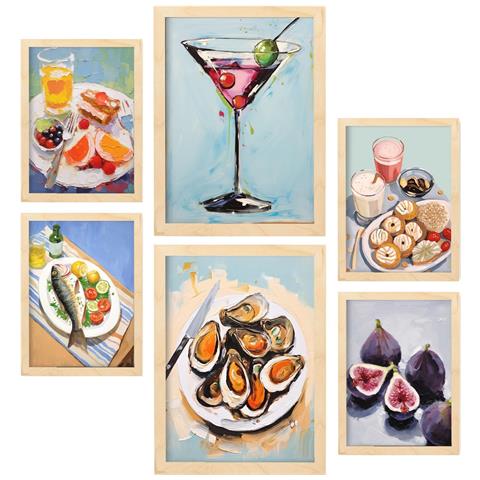 Set Di 6 Stampe Mix Di Cibo In Set Dipinti Decorativi Estetici Per Il Tuo Soggiorno, Camera Da Letto, Casa A3 & A4 Telaio In Legno Chiaro