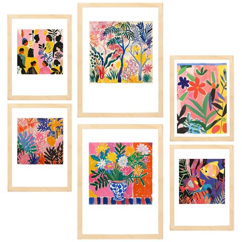 Set Di 6 Stampe Pittura Decorativa Colori E Forme Di Matisse Incorniciata Con Illustrazioni Di Design Per Le Pareti A3 & A4 Telaio In Legno Chiaro