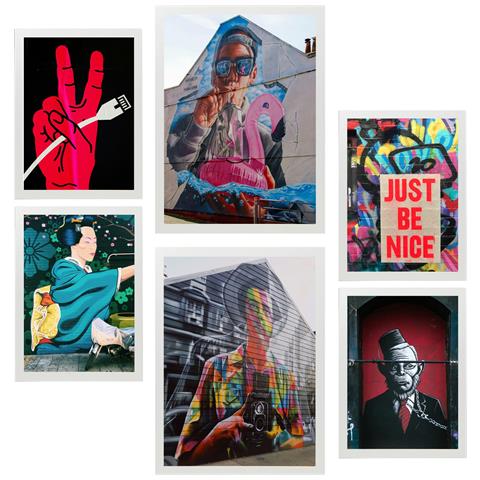 Set Di 6 Stampe Pittura Decorativa, Graffiti, Street Art Colorata Incorniciata Con Illustrazioni Di Design Per La Decorazione Murale A3 & A4 Cornice Bianca